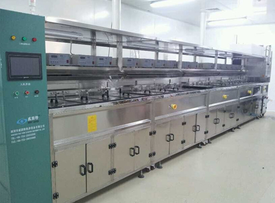 自動上料→1槽清洗劑超聲清洗28K→2槽清洗劑超聲清洗40K→3槽純水超聲漂洗28K→4槽純水超聲漂洗40K→5槽純水超聲漂洗40K→6槽熱風烘干→自動下料。