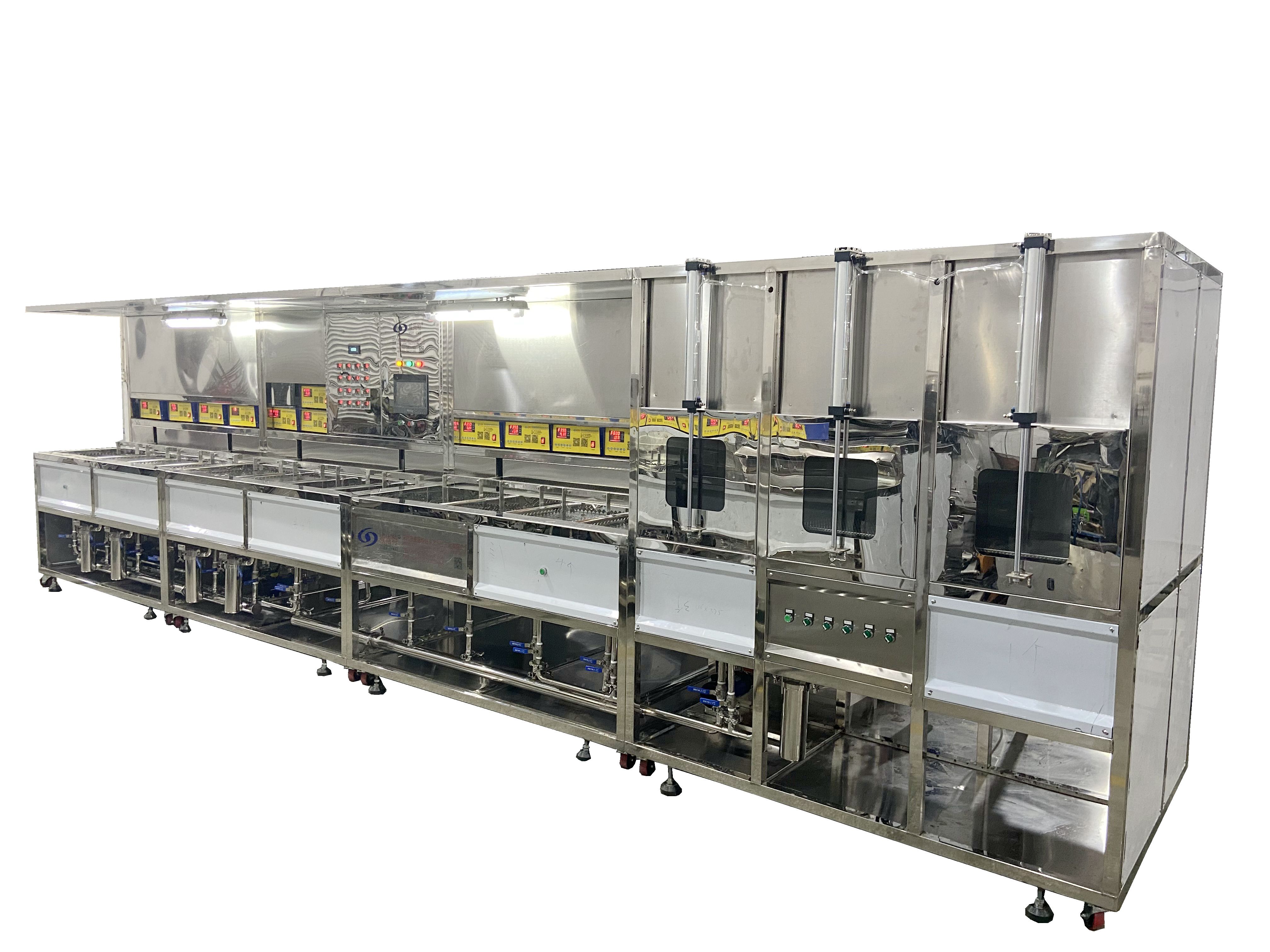 人工上料→自動上料→1 超聲浸泡酸洗→2 噴淋漂洗→3 超聲純水漂洗(拋動)→4 超聲純水漂洗(拋動)→5 超聲純水漂洗→自動下料→人工下料。