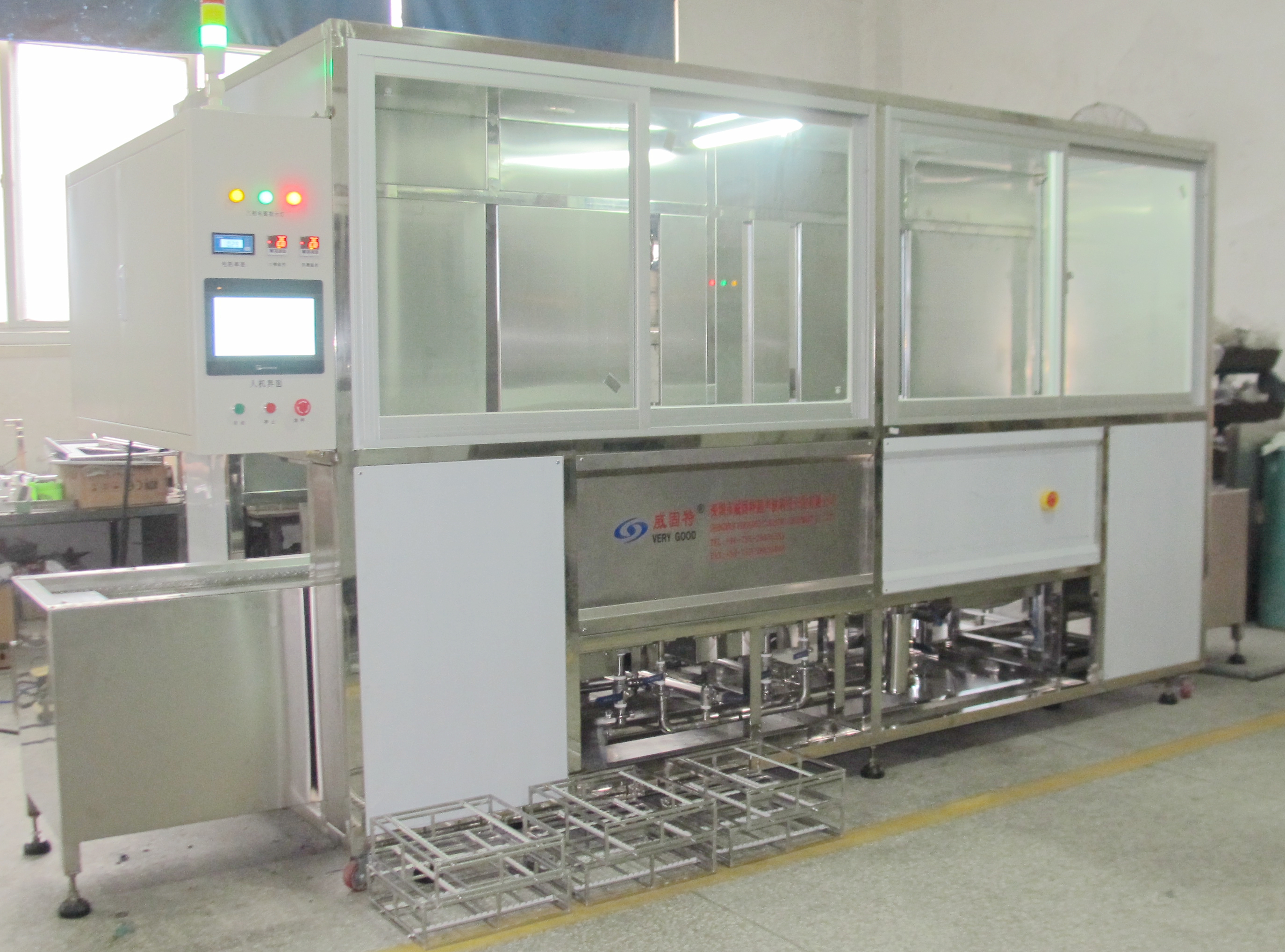 在清洗過程中工件通過超聲波高頻產生的“氣化現象”的沖擊和系統自身不停地作上下運動,增加了液體的摩擦,從而使工件表面的污垢能夠迅速脫落,實現其高清潔度的目的。